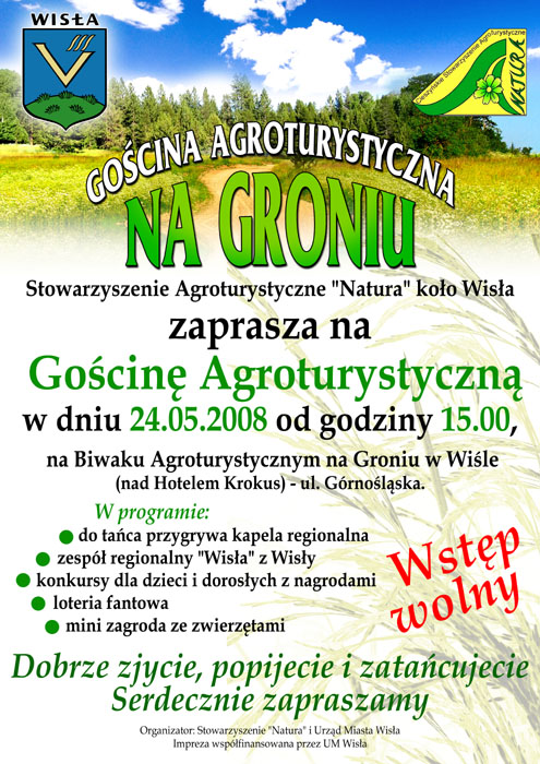 Już po raz drugi nasze koło agroturystyczne organizuje festyn pod nazwą „Gościna Agroturystyczna na Groniu”. Zabawa, dla wszystkich turystów, odbędzie się 24 maja 2008 roku. Zaczynamy o godzinie 15:00, na terenie biwaku „Na Groniu”. Impreza ma charakter otwarty - wstęp wolny dla wszystkich chętnych. Podobnie jak w poprzednim roku, przygotowujemy wiele atrakcji: konkursy, licytacje, mini zagrodę ze zwierzętami, gry i zabawy. W powietrzu brzmieć będą skoczne melodie góralskiej kapeli "Wisła". Smakoszy zapraszamy do naszych stoisk ze zdrowymi, regionalnymi potrawami. Stoły ugną się od placków ze szpyrkami, kaszonek (krupnioków), żebroczek, kołoczów wiślańskich, kreplików beskidzkich, pajd chleba ze „szmolcem” i kit w kapuście.